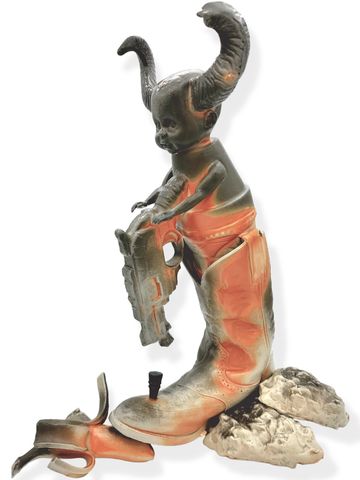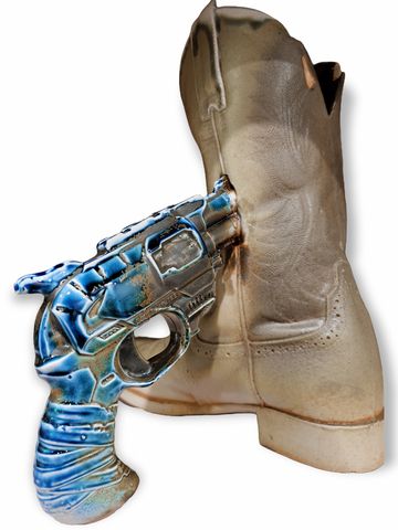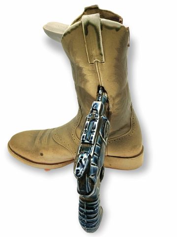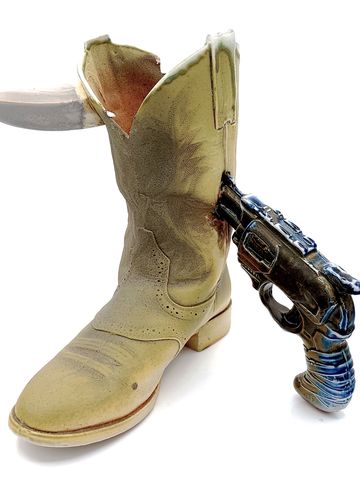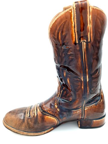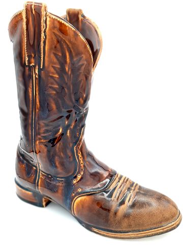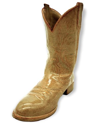 Ol' Reliable, 2021, Dimensions: 10.5inL x 4.5inW x 11inH, Porcelain Cowboy Boot Vase, Mold-making and Slip-casted Sculpture, Custom Porcelain Slip Recipe, Fired to Cone 6 Oxidation, Nutmeg Shino Glaze.
